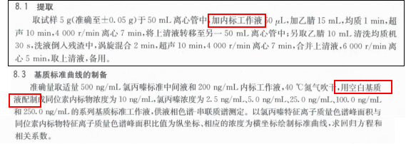 GB 31656水产品兽残检测相关系列标准中多项标准都选用了溶剂-同位素内标法进行定量分析,如《GB 31656.9-2021 水产品中二甲戊灵残留量的测定 液相色谱-串联质谱法》