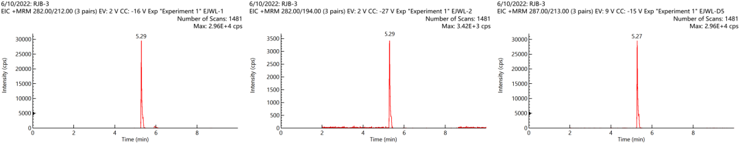 图1 二甲戊灵(282/212、282/194)、二甲戊灵-D5(287/213)标准溶液谱图